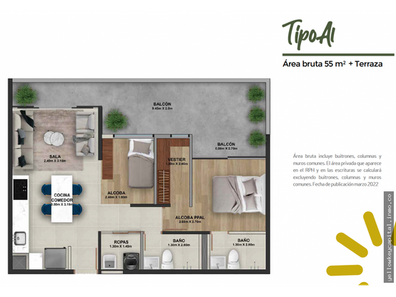 This modern 1-bedroom apartment is located in the exclusive Las Lomitas area of Sabaneta. Part of the Entre Aires project, it features 55 m² with 2 balconies, 2 bathrooms, 1 parking space, and a storage room. A study can serve as an additional bedroom, offering flexibility for singles or couples.